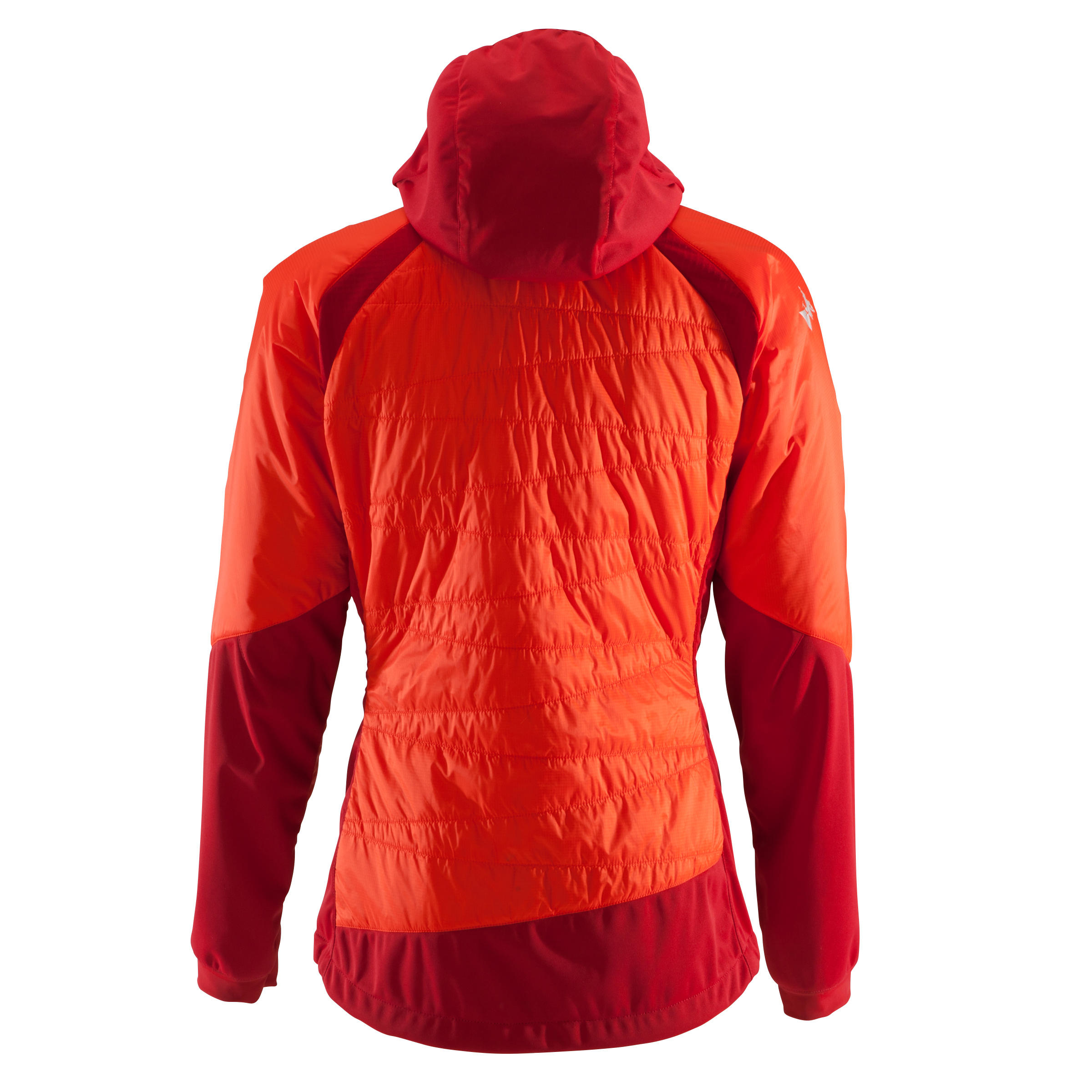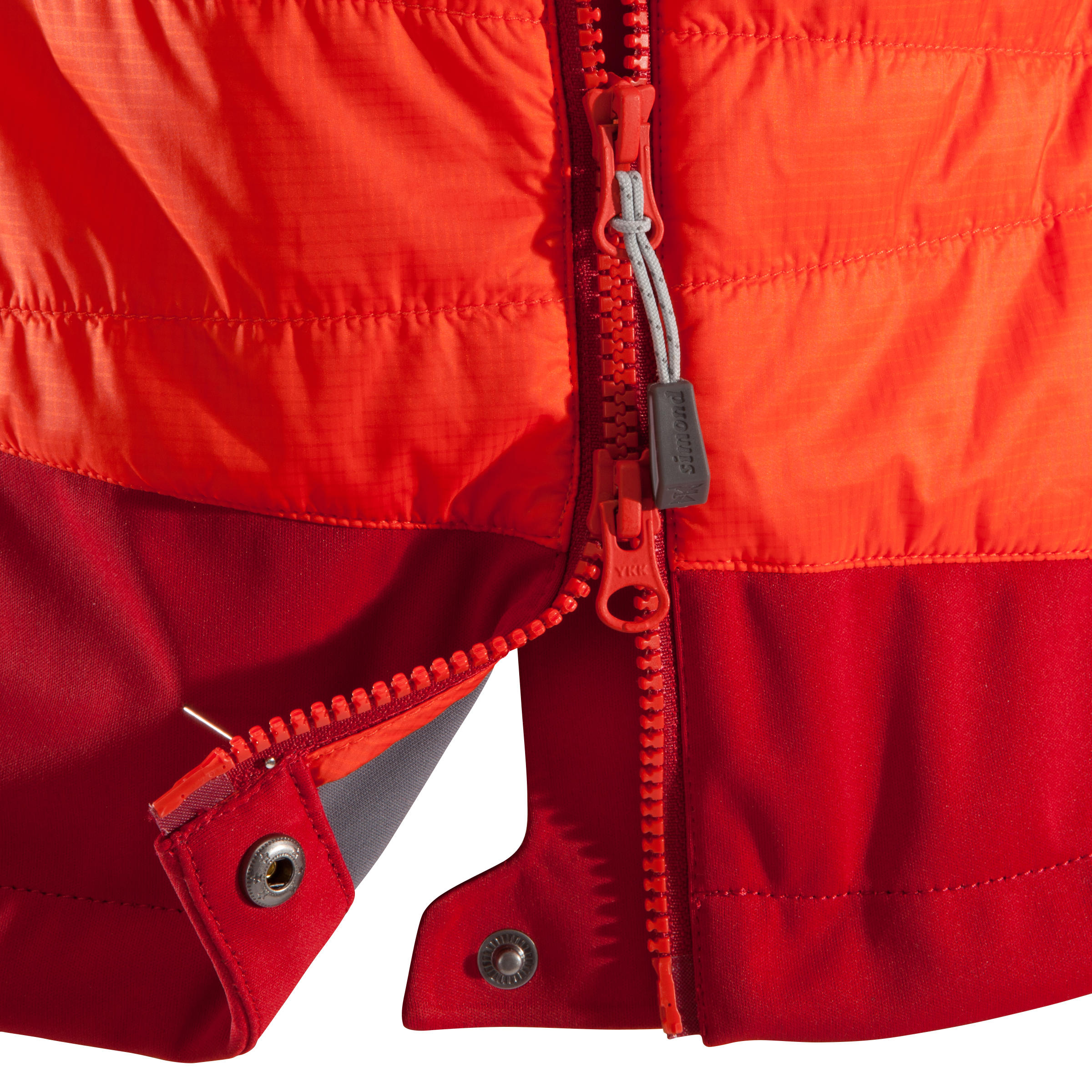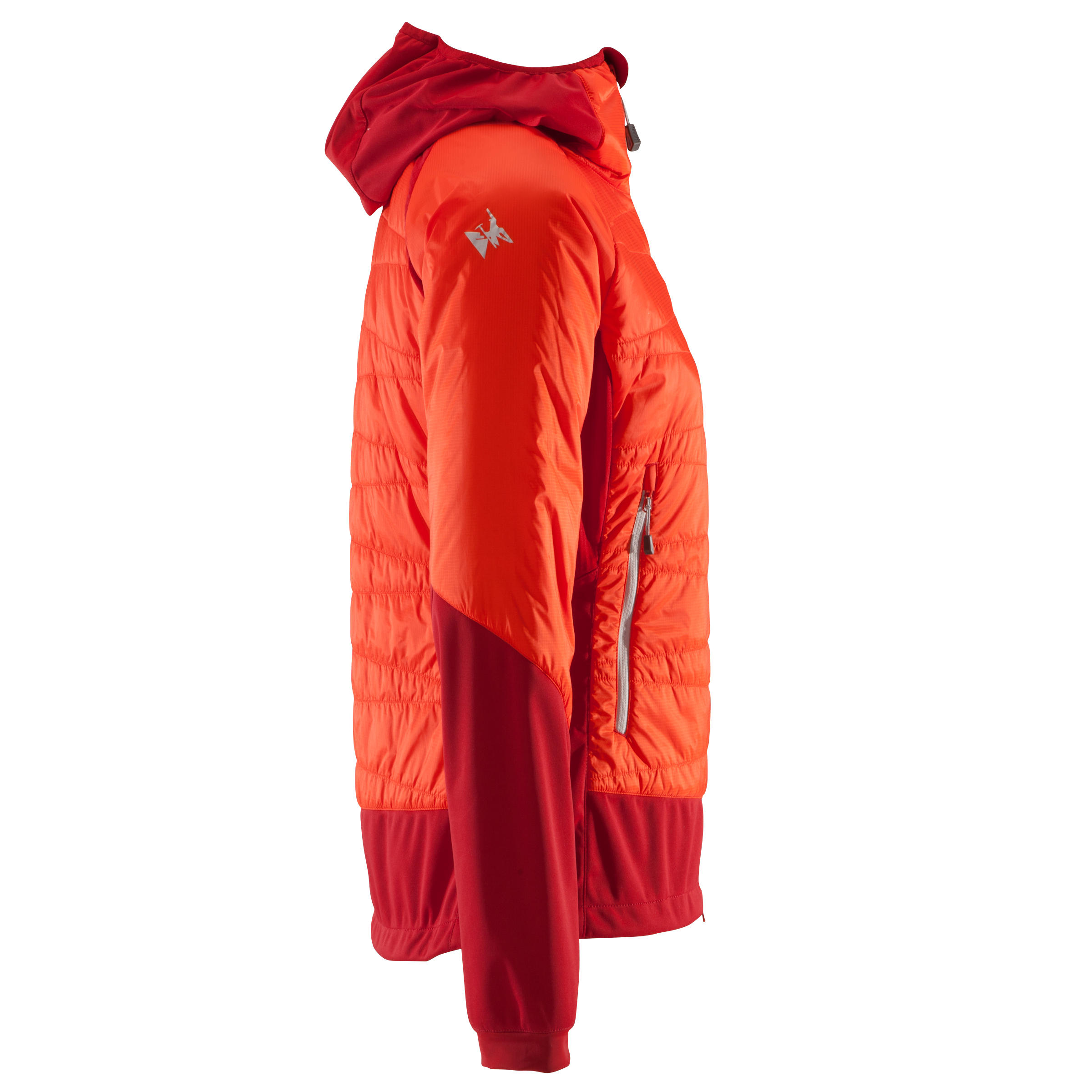 Hybrid jacket made from several materials: filling / softshell stretch / fleece. These fabrics are used in inserts in targeted areas. Scarf built into hood for wind protection