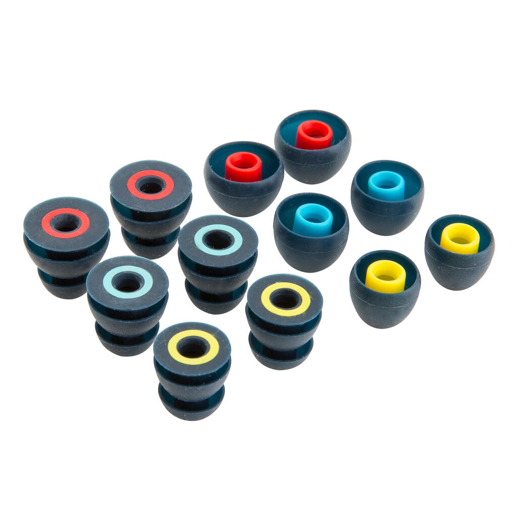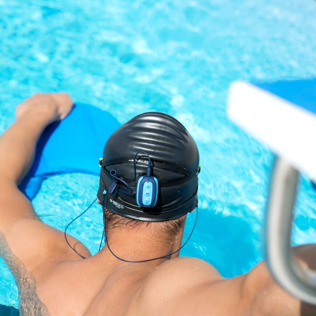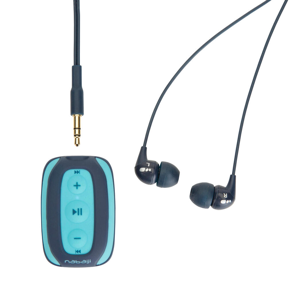 These headphones and MP3 player are particularly suited to low or moderate-intensity swimming sessions with the goal of relaxation. Before the first session, take the time to try on the different earbuds (shapes and sizes) to ensure a perfect fit during use. Make sure they are fully inserted in the ear by slightly turning them until there is a perfect seal. It may be necessary to wear a swim cap over the headphones.
