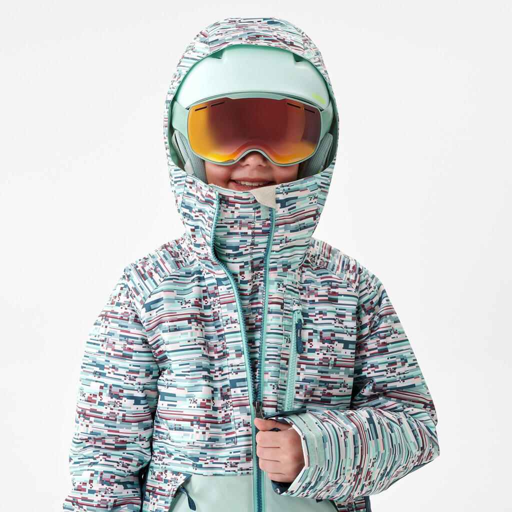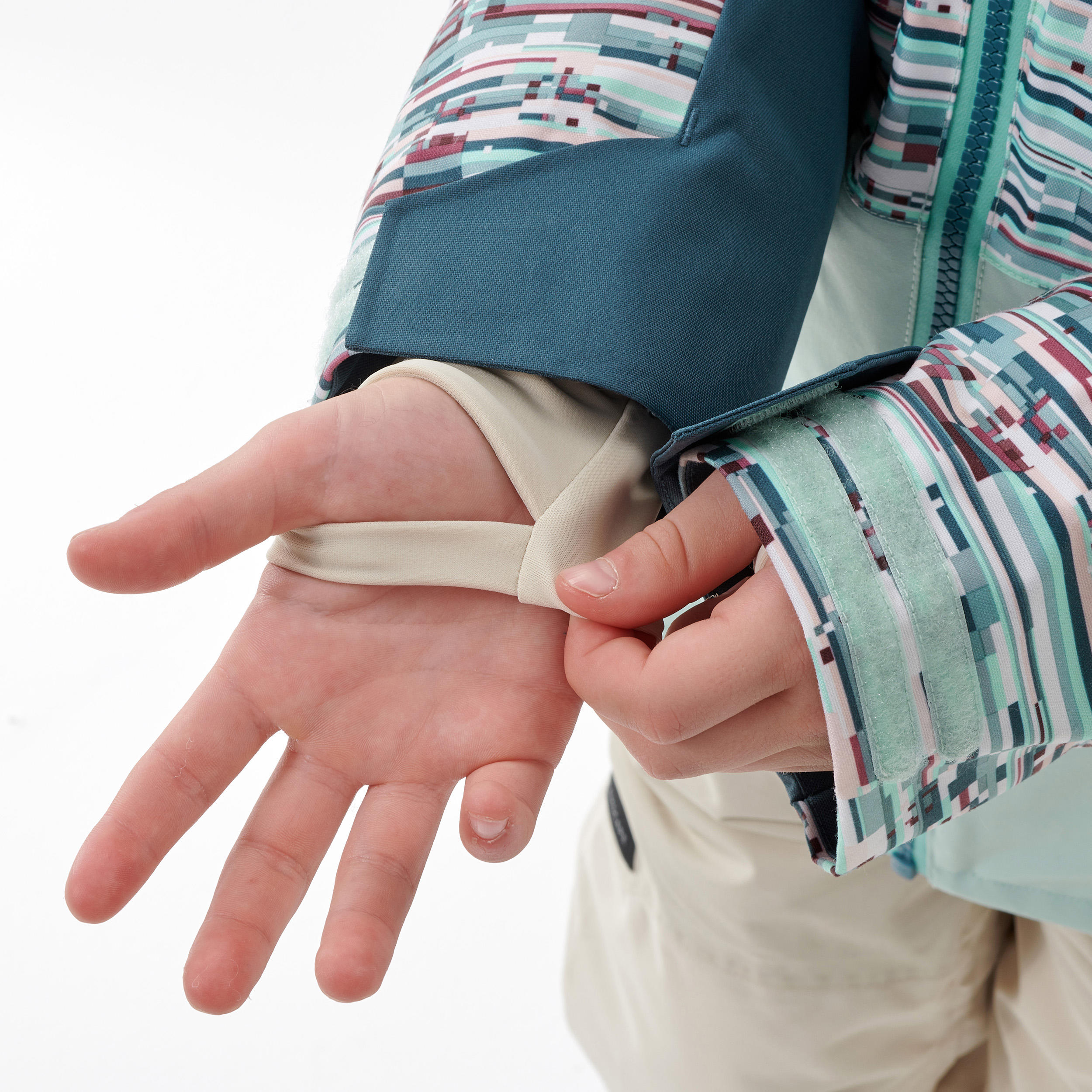 Jacket and long sleeves with cuffs that have thumb holes to prevent snow from getting inside the sleeves, elbow and side reinforcements for durability, snow skirt, ski pass holder.