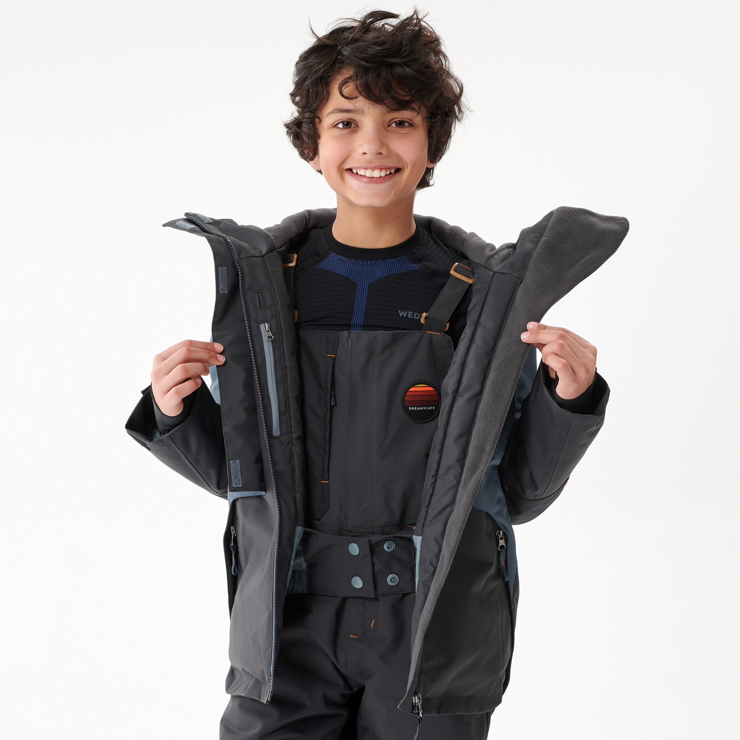 The water-repellent property of a fabric is its ability for water to form on the surface without being absorbed because of a treatment applied to the outer surface of the fabric. The fabric does not soak up water and stays light and warm. This treatment must be renewed during the life of the product, after 2 to 3 washes on average, using products available in our stores. All the waterproof jackets that we design for snowboarders are water-repellent.