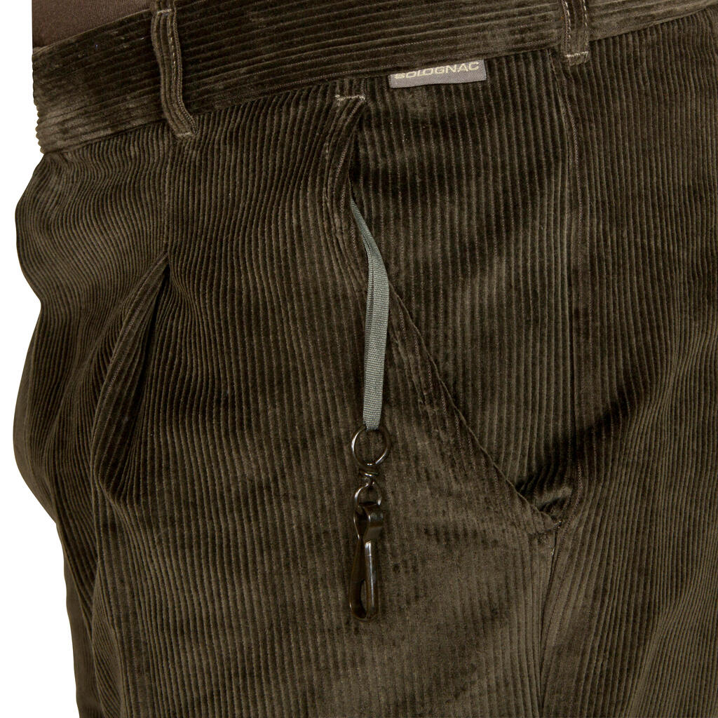 Knife pocket, tightening tab on knees and non-slip belt.