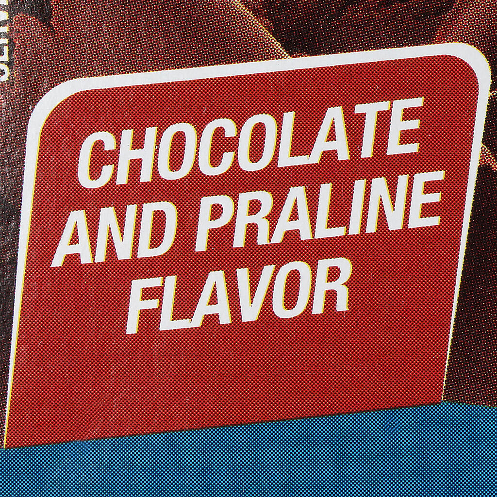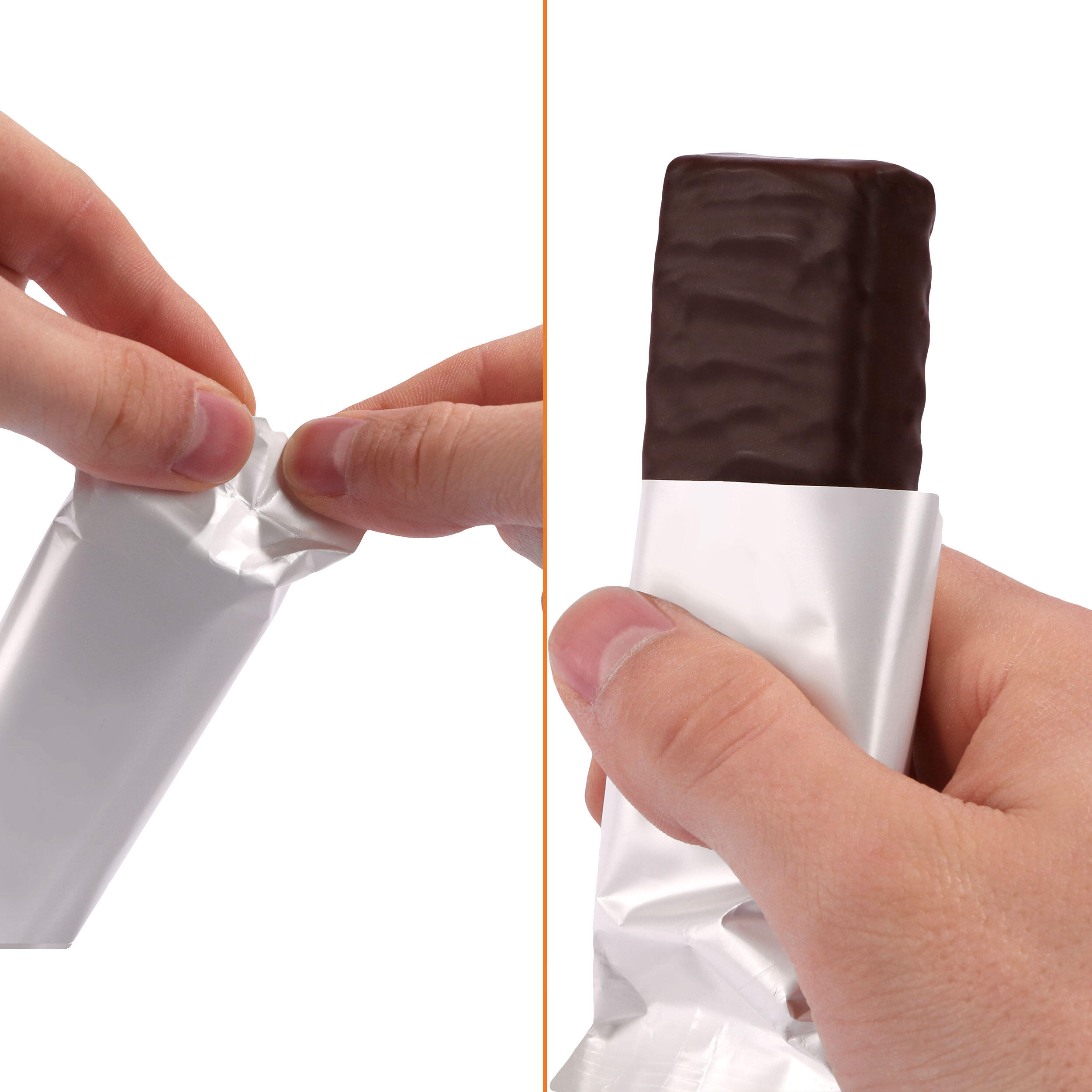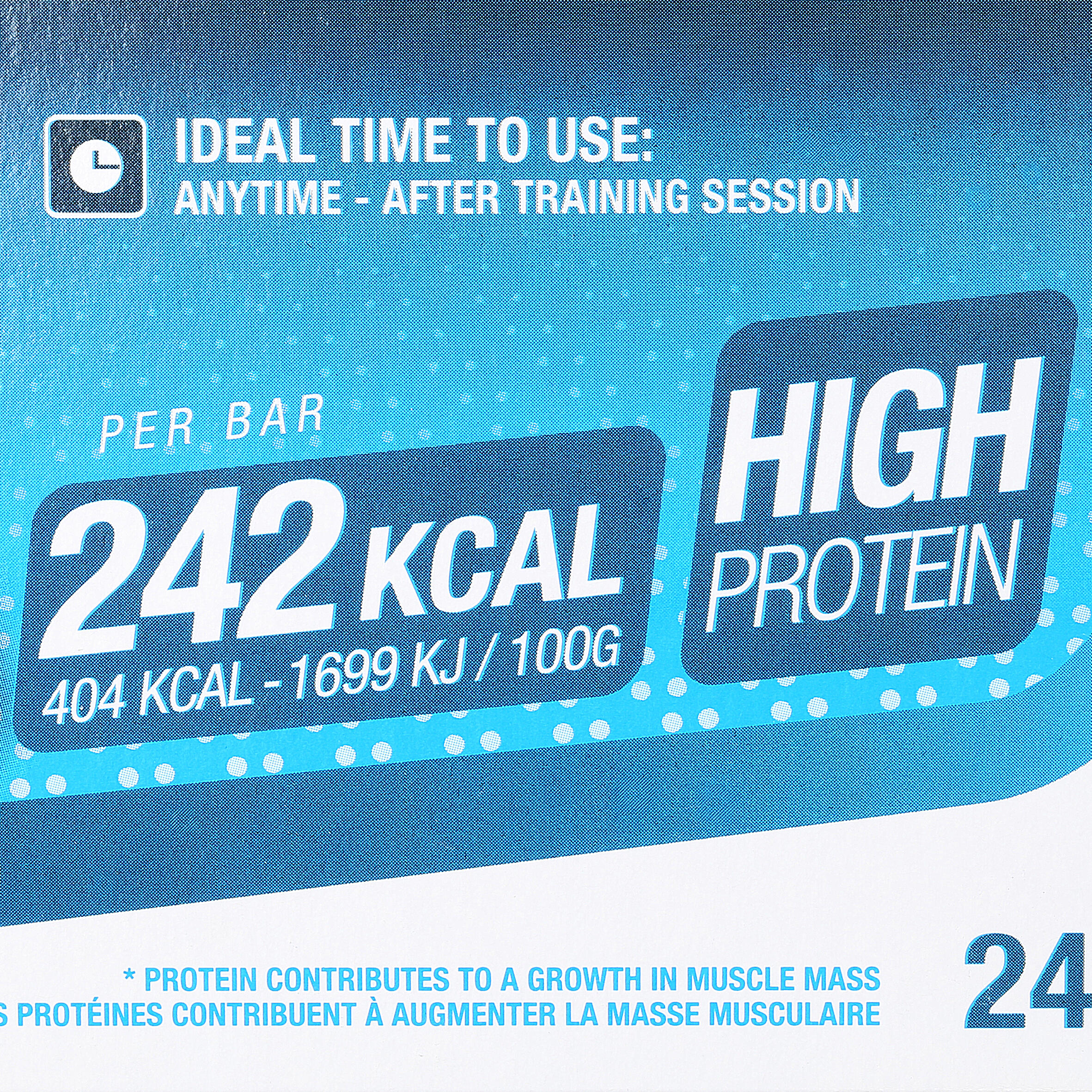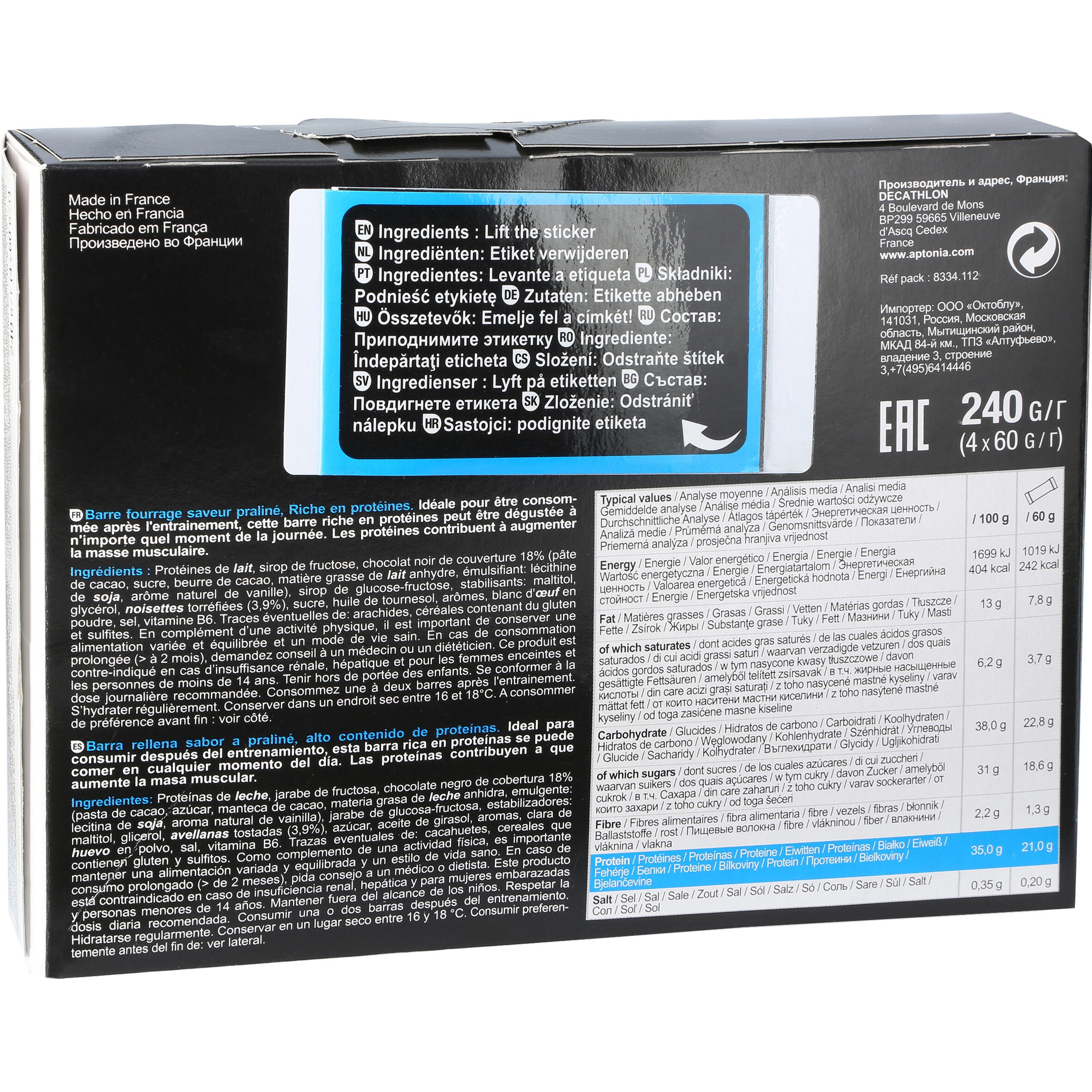 Bar with praline flavoured filling, rich in proteins. Ingredients: MILK* proteins, fructose syrup, dark chocolate coating 20% (cocoa mass, sugar, cocoa BUTTER*, anhydrous MILK* fat, emulsifier: SOYA* lecithin, natural vanilla flavour), glucose-fructose syrup, stabilisers: maltitol, glycerol, roasted HAZELNUTS* (3.4%), sugar, sunflower oil, flavouring, powdered EGG* white, salt, vitamin B6. ; May contain traces of PEANUTS*, CEREALS* containing GLUTEN* and SULPHITES*.; * Allergens
