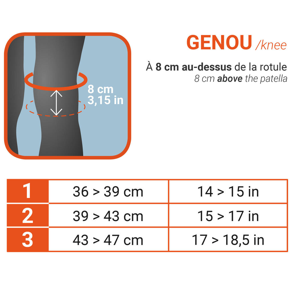 Measure around your leg, 8 cm above your kneecap. Then match the measurement taken with the following size chart: