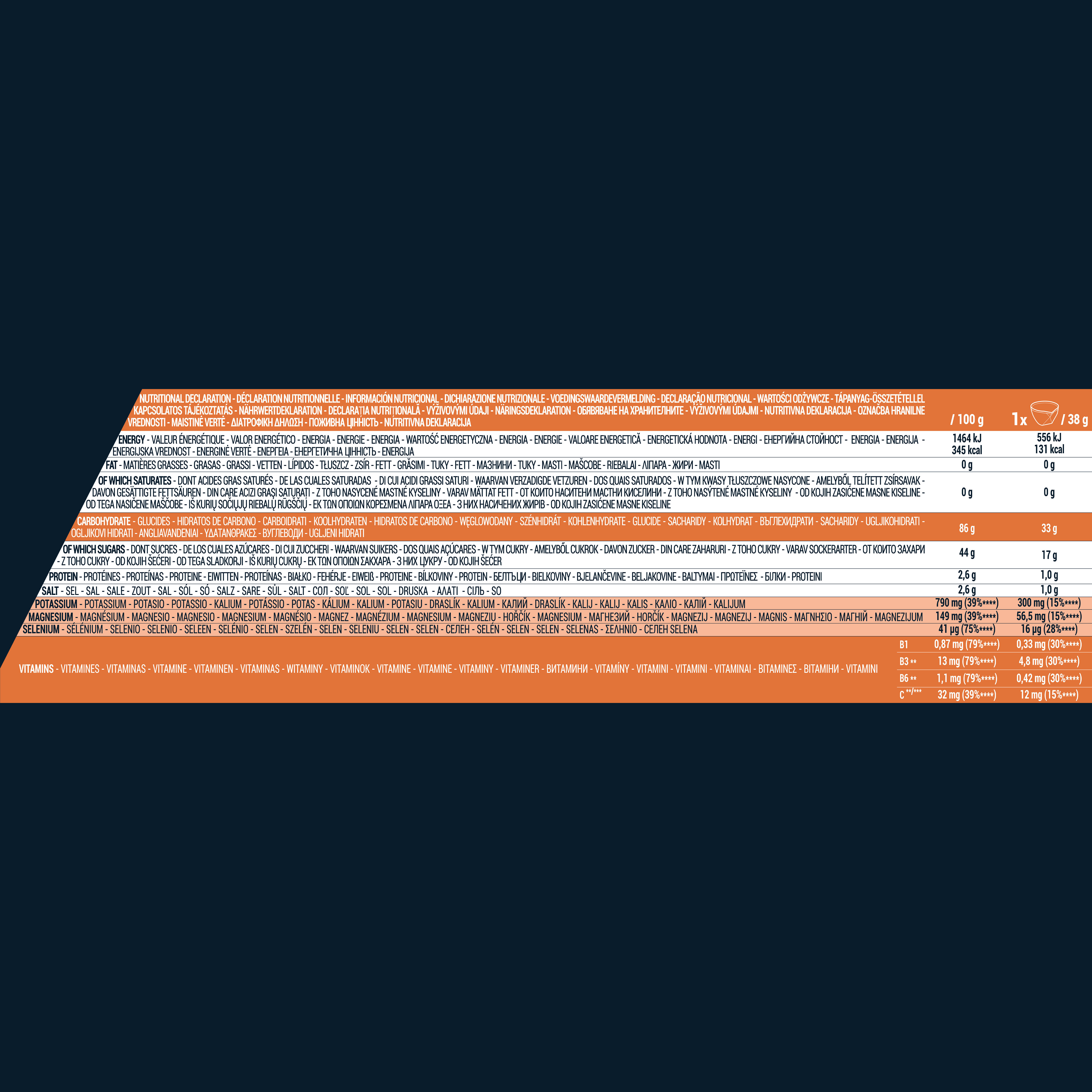 Powder preparation for isotonic sports drinks with branched amino acids and flavouring. High in vitamins B1, B3 and B6. Source of vitamin C, magnesium, potassium and selenium. Orange flavour. Ingredients: Maltodextrin (46%), saccharose (29%), fructose (12%), acidity regulator: citric acid, sodium citrate, BCAA (2.6%): L-leucine, L-valine, L-isoleucine, potassium chloride, sodium chloride, magnesium citrate, natural orange flavouring with other natural aromas, vitamins: thiamine mononitrate (B1), niacinamide (B3), pyridoxine hydrochloride (B6), concentrated acerola juice, colouring food (concentrated carrot, hibiscus), sodium selenite, colouring agent. beta-carotene.; May contain traces of: GLUTEN, SHELLFISH, EGG, FISH, SOYA, MILK, CELERY, SULFITES, NUTS, MOLLUSCS, LUPINE