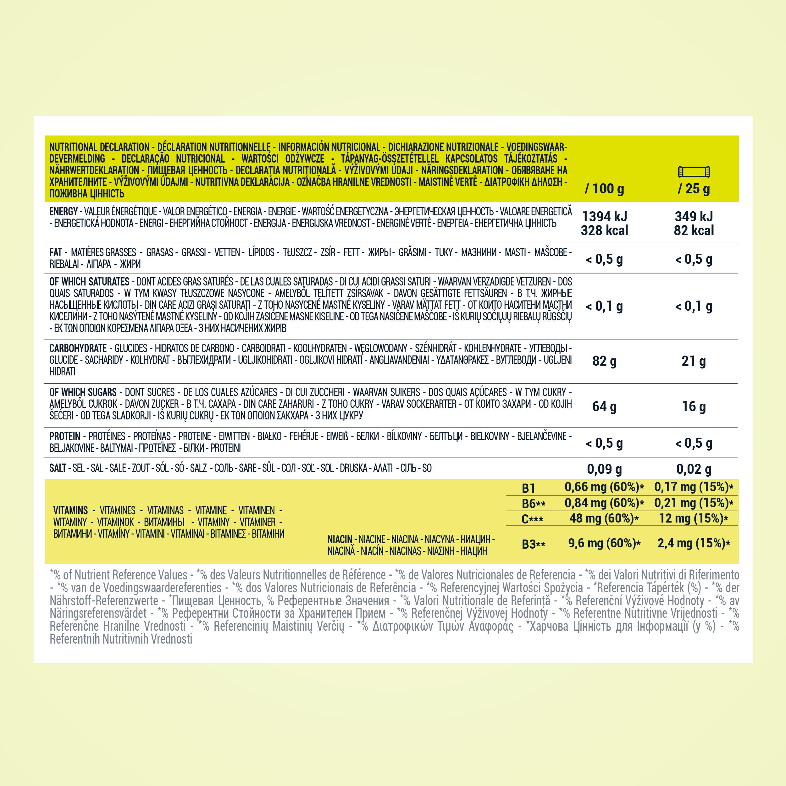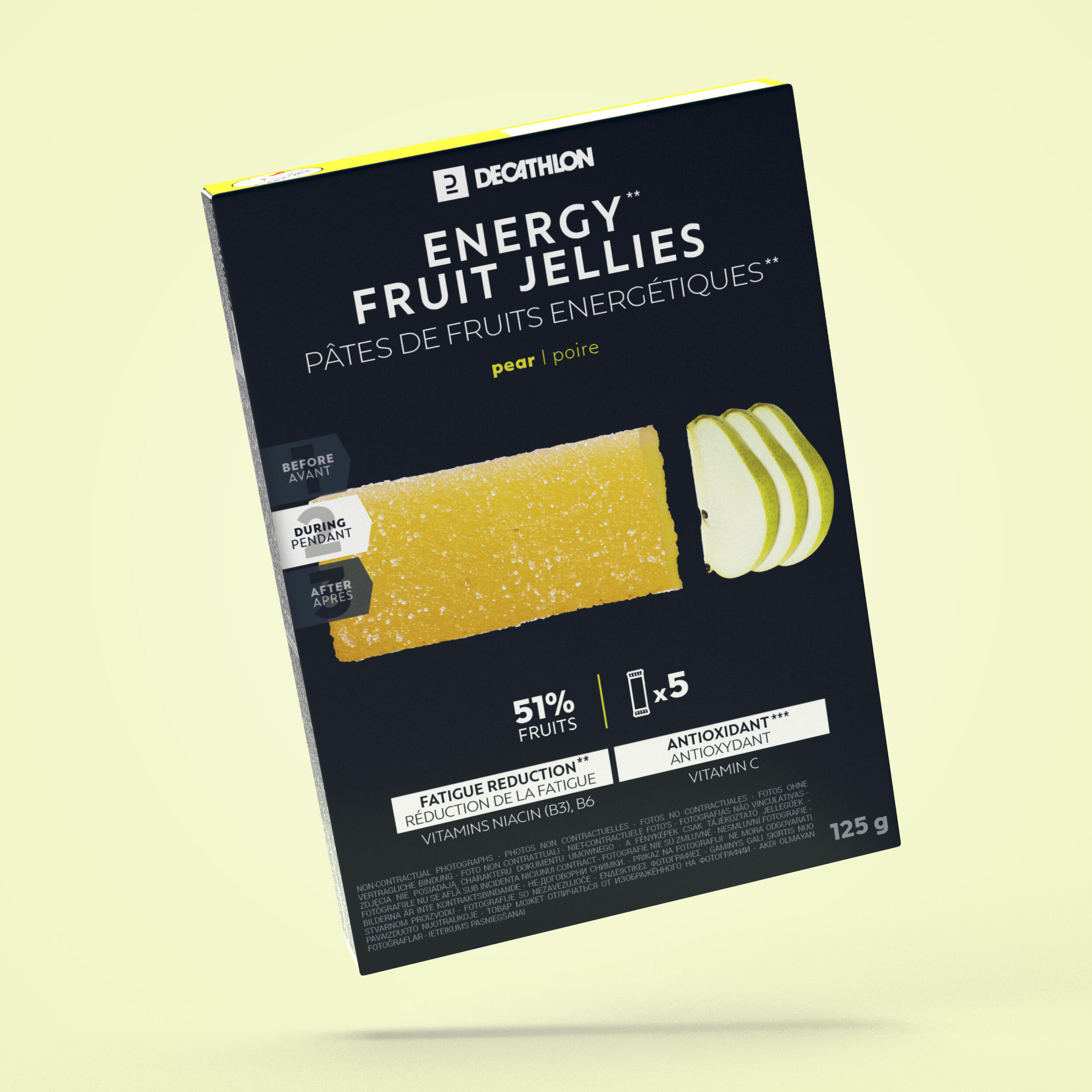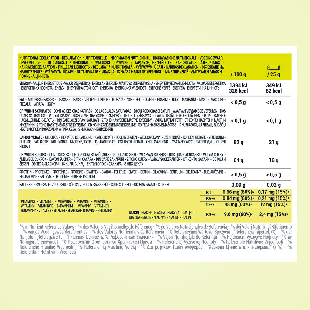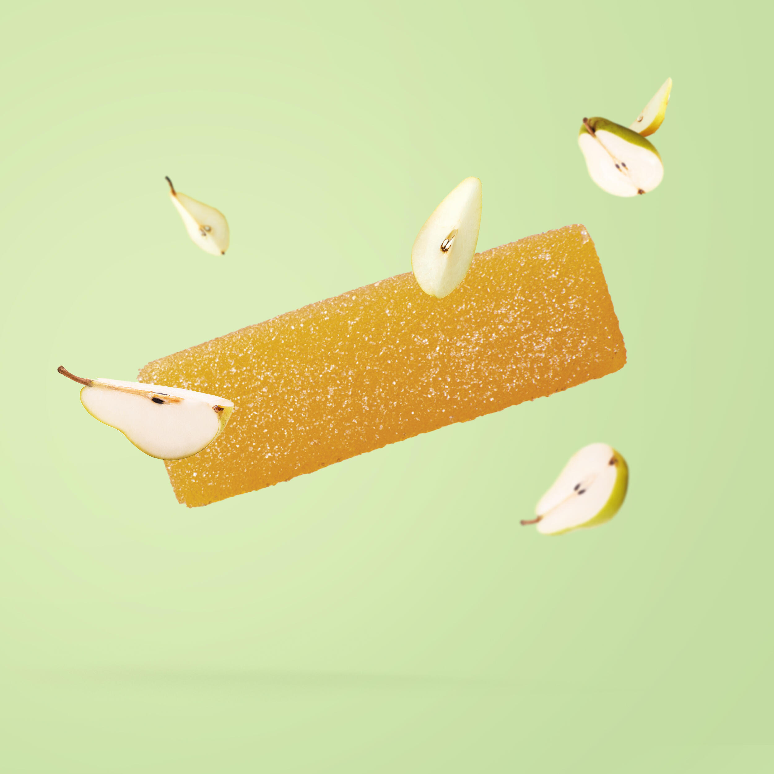 Nutritionists recommend 60 g of carbohydrates (= sugar) per hour of sport for workouts longer than 3 hours. This 25g fruit jelly contains 21g of carbohydrates, of which 16g are simple sugars. We recommend that you bite into your first bar after 30 minutes of sport, i.e. two an hour (or one bar + one gel/one bar), in addition to an isotonic drink.