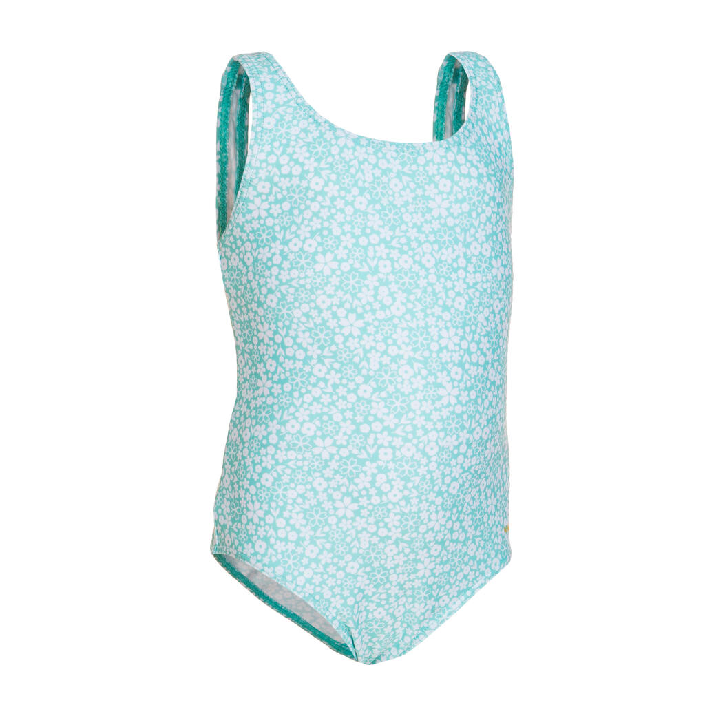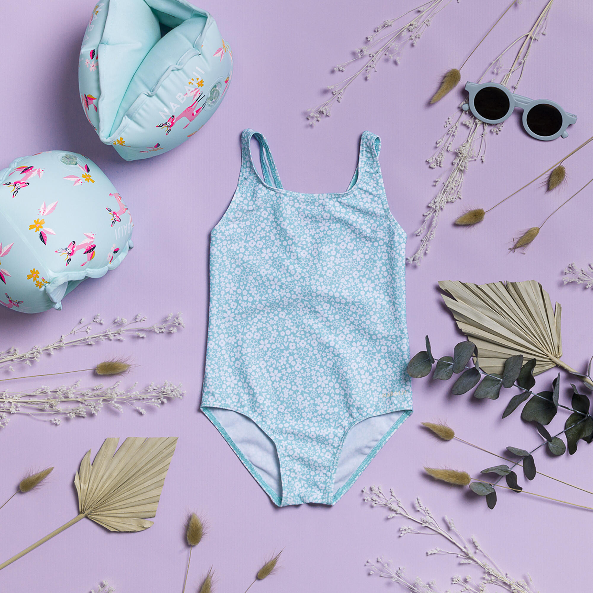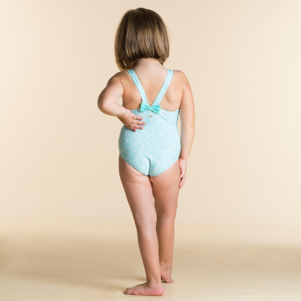 One-piece printed swimsuit with wide shoulder straps and a knot at the back. A swimsuit for baby girls up to 24 months old that goes on over the head thanks to the press studs at the crotch.