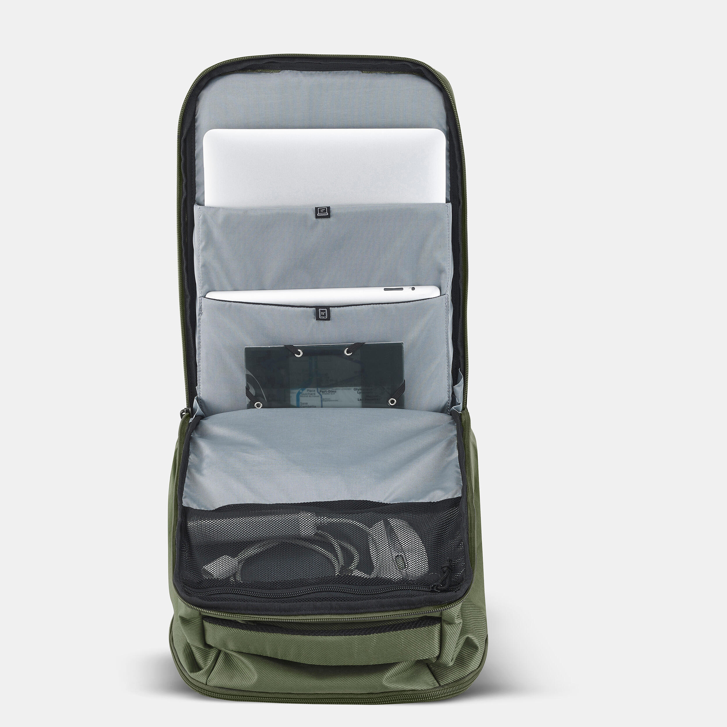1 compartment with a secure zip, including 2 pockets for a 17" laptop and 15" tablet, which are raised to avoid shocks.