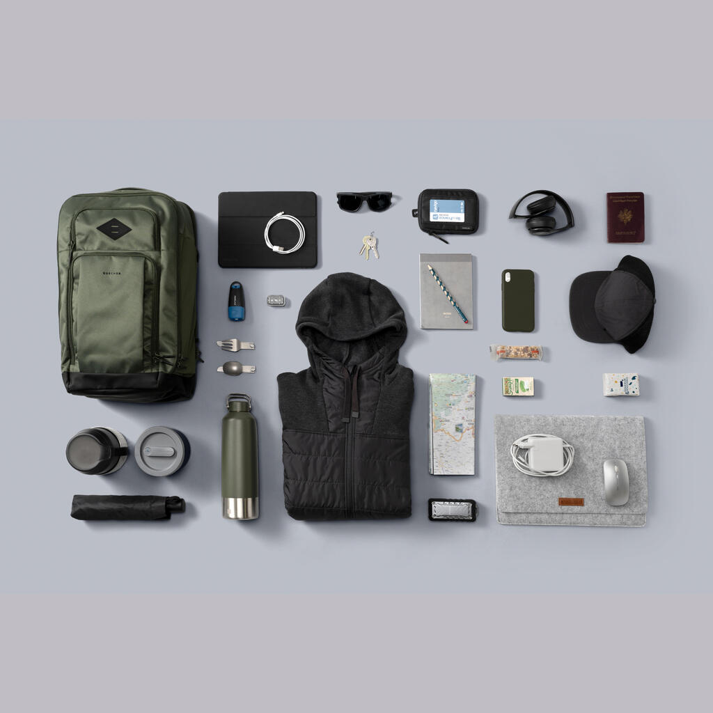 Place the heavy items, e.g. laptop, picnic, etc., in the bottom and in the spaces provided. Pack your clothes around these items. Put the small belongings that you will use during the day (sun cream, map, sunglasses, etc.) in the pockets. Put the water bottle(s) in the outer pockets on the sides that are made for this purpose.