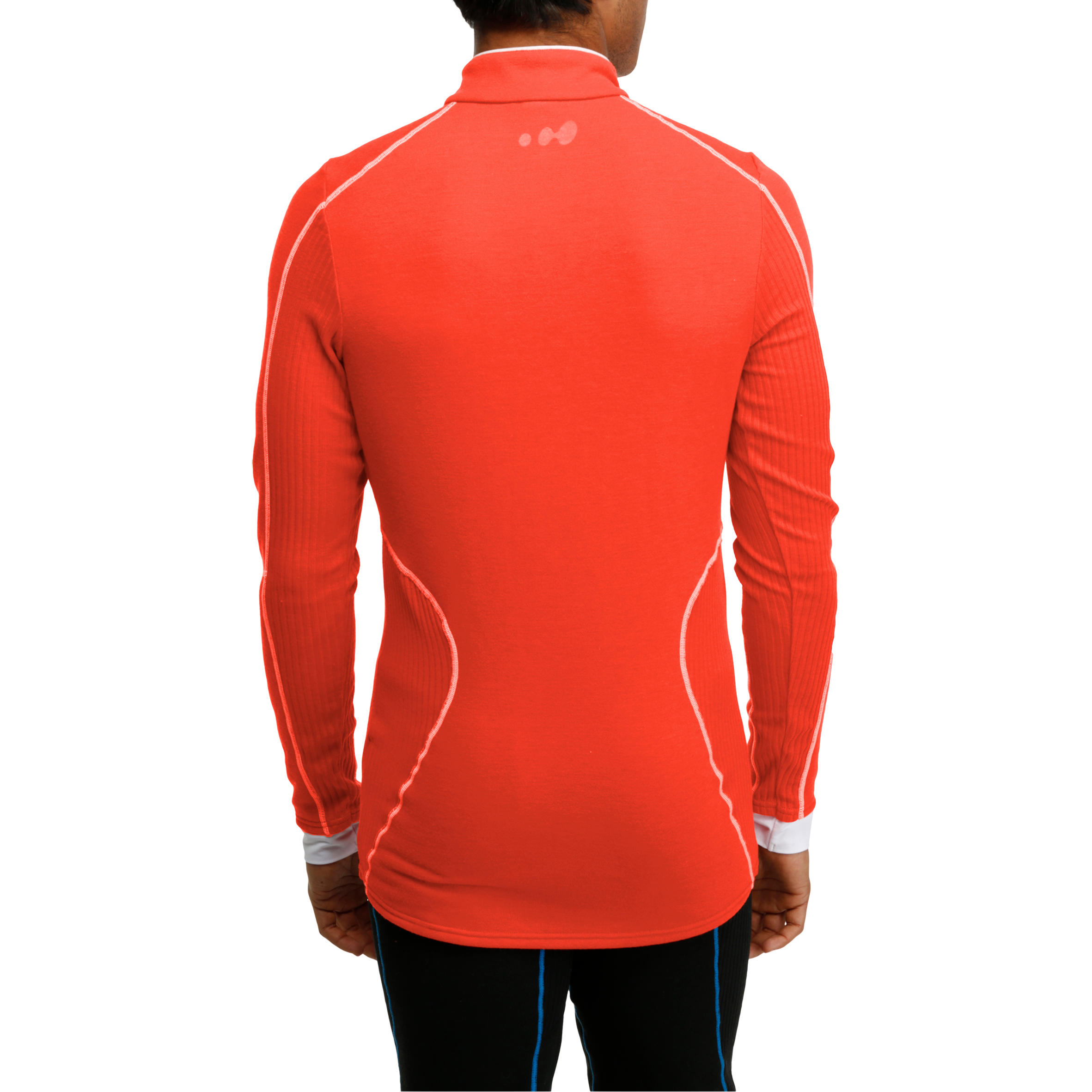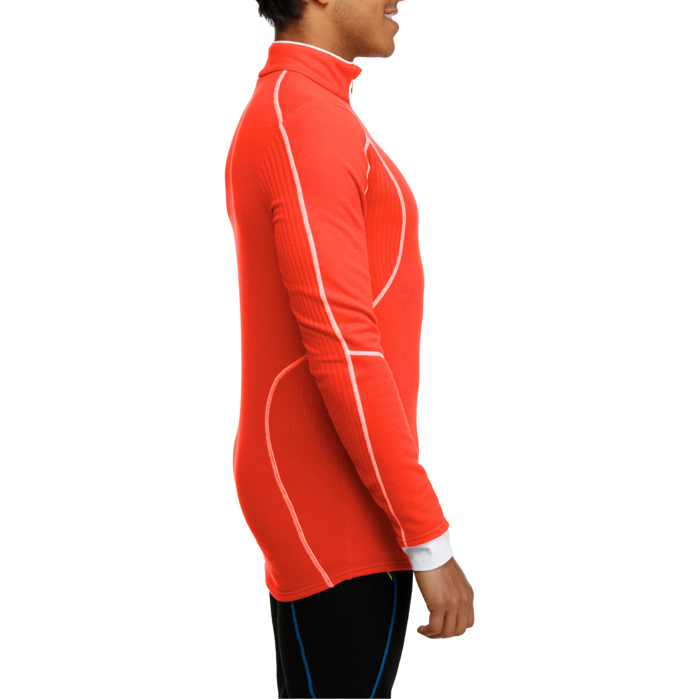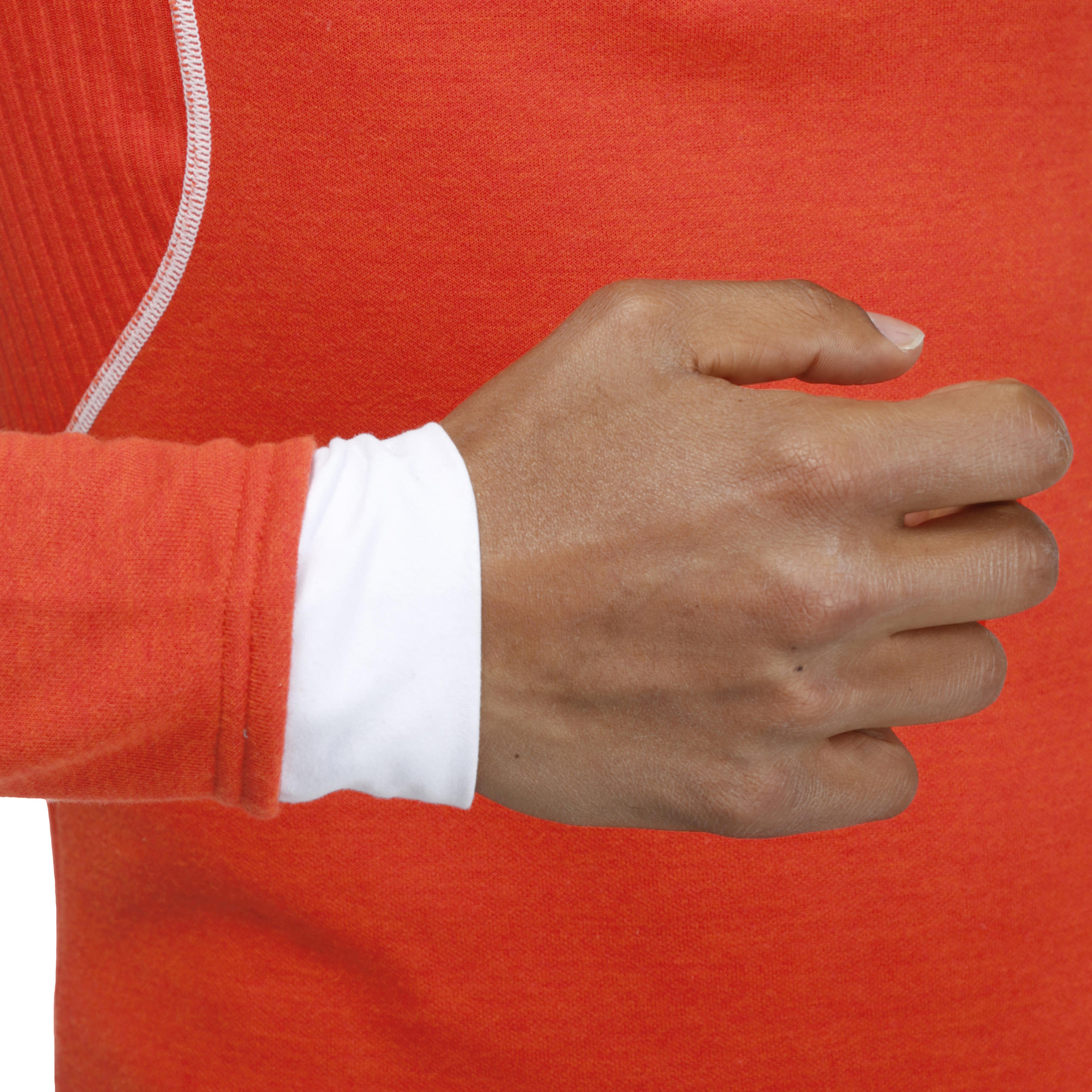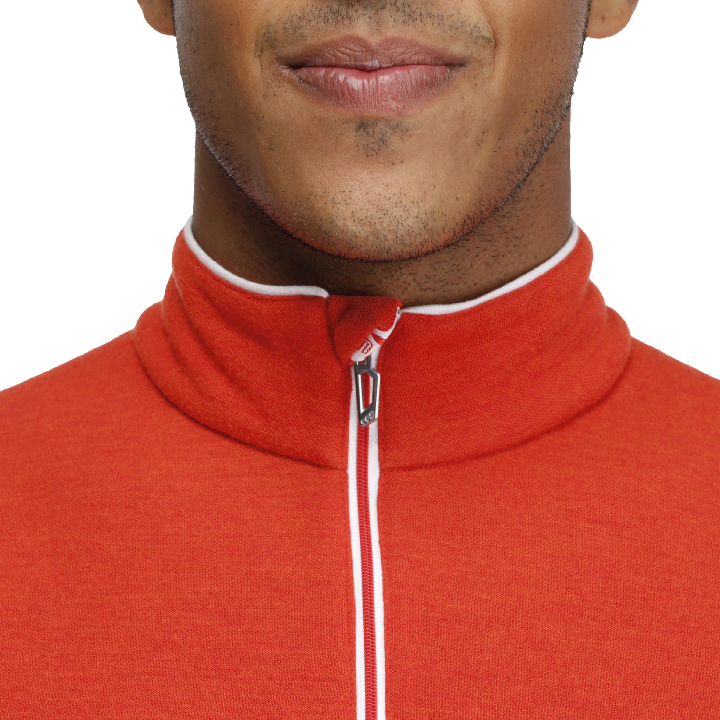 A raised collar and zip so you can adjust warmth of garment. A non-brushed material used under arms, offering greater stretch than main material and good perspiration wicking.